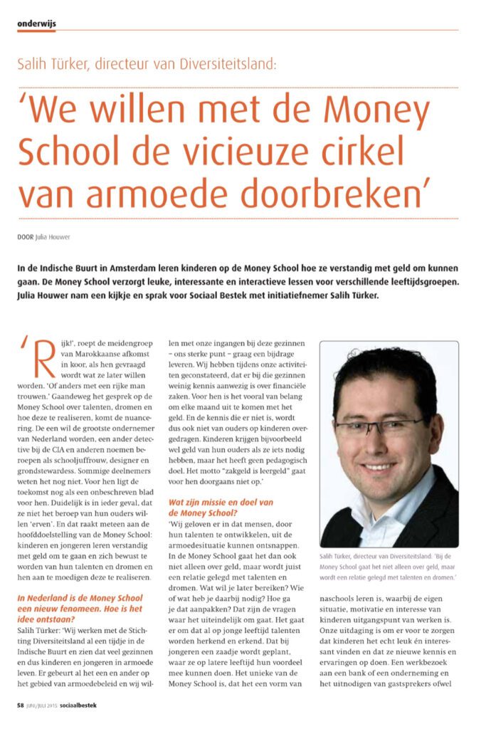 Money School wil de vicieuze cirkel van armoede doorbreken. In de Indische Buurt in Amsterdam leren kinderen bij Money School hoe ze verstandig met geld om kunnen gaan. Money School verzorgt leuke, interessante en interactieve lessen voor verschillende leeftijdsgroepen. Julia Houwer nam een kijkje en sprak voor Sociaal Bestek met initiatiefnemer Salih Türker.
